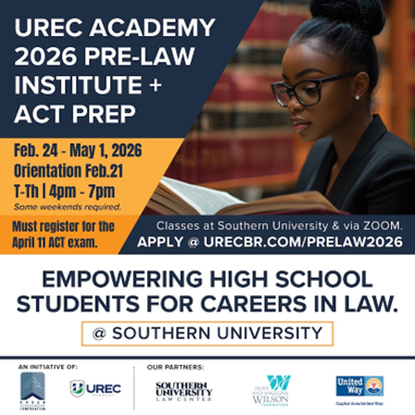 UREC Academy is sponsoring the Pre-Law Institute plus ACT Prep starting February 21, 2026 through May 2, 2026 on the campus of Southern University. To REGISTER, please sign-up at urecbr.com/prelaw2026. This program is open to all High School Students and it's FREE TO PARTICIPATE. For more information, please contact Sister Lauri Patterson at (225) 284-5418.